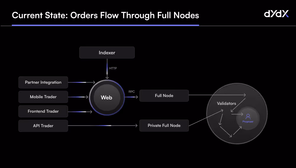 In today’s dYdX architecture (original blog post here), orders from traders — whether via the web app, mobile, API, or third-party integration — are submitted to full nodes, which then gossip them across the network until they reach the current block proposer.